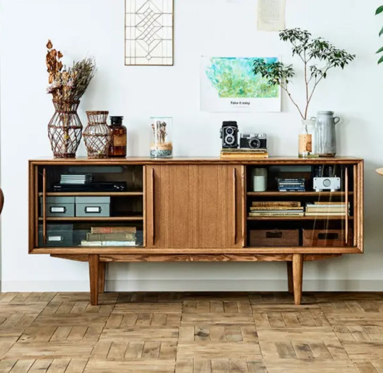 モダンで洗練されたデザインが魅力のストックサイドボード。リビングや寝室など、どんなお部屋にも調和するシンプルながらも高級感のある仕上がりです